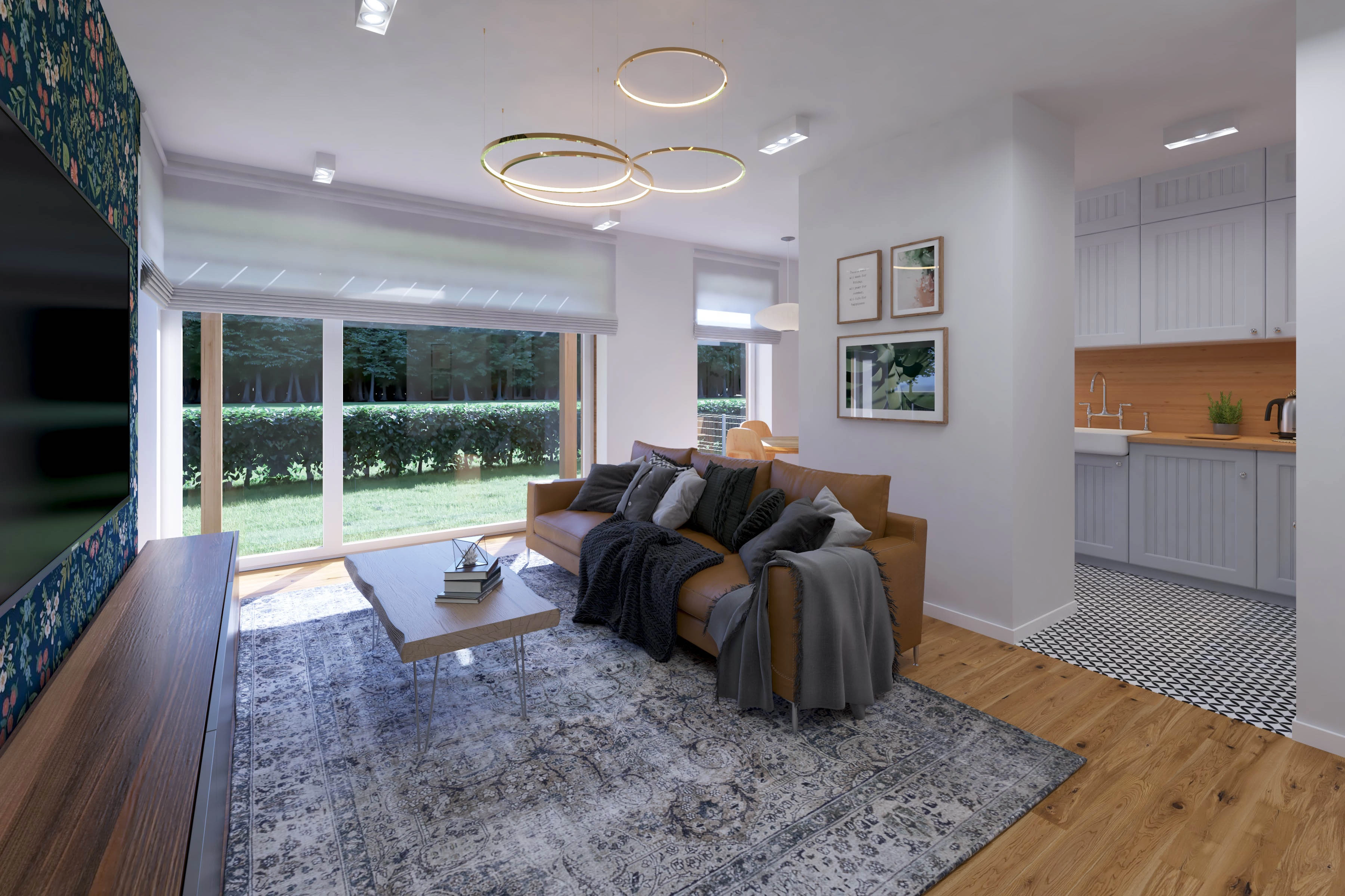Architektura osiedla bazuje na minimalistycznej elegancji – biele, szarości i drewno idealnie komponują się z sąsiadującym lasem. Do każdego lokalu przynależy garaż, dodatkowe miejsce postojowe oraz prywatny ogród. O bezpieczeństwo mieszkańców dba całodobowy monitoring i zamknięty charakter osiedla.