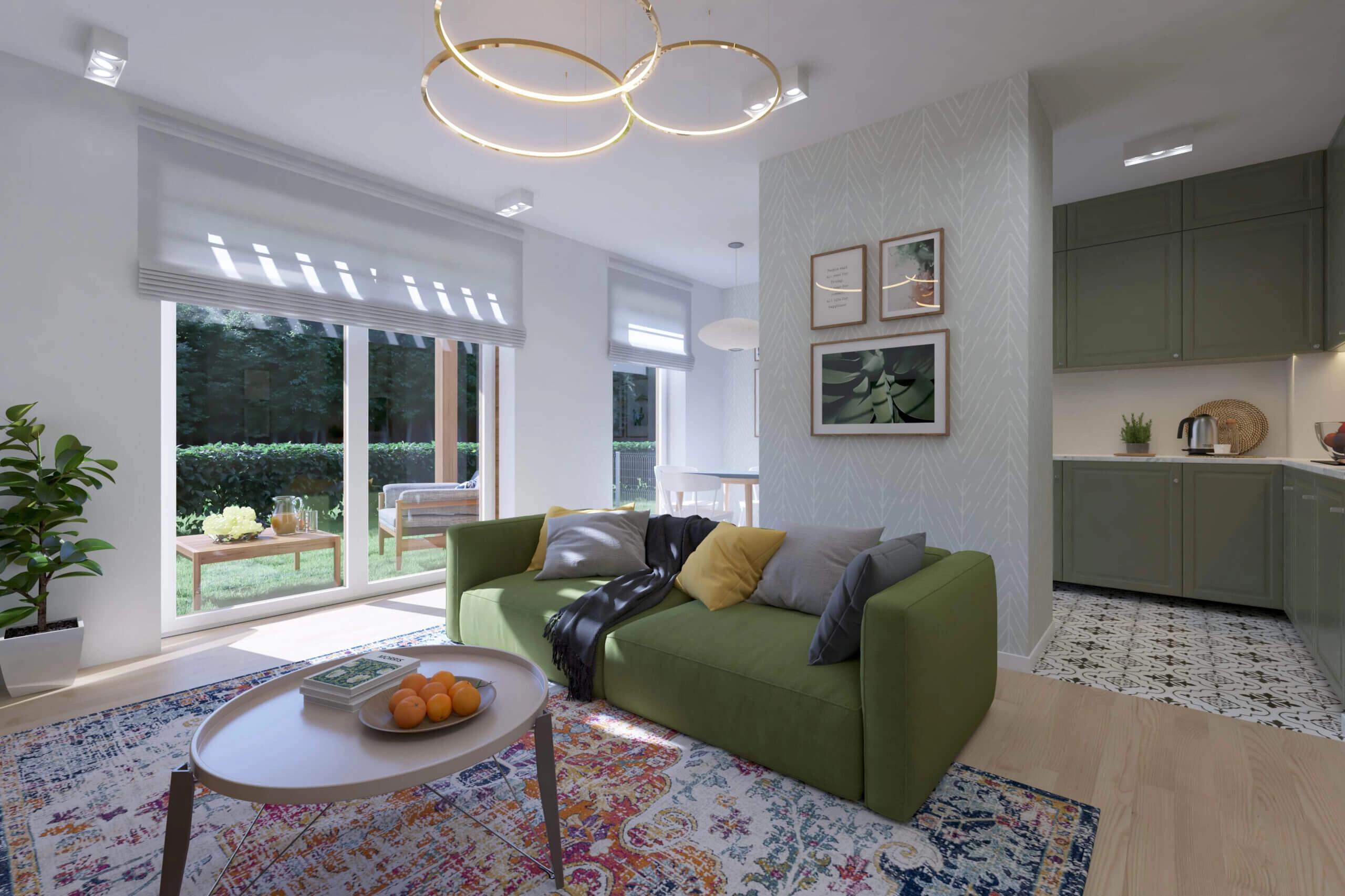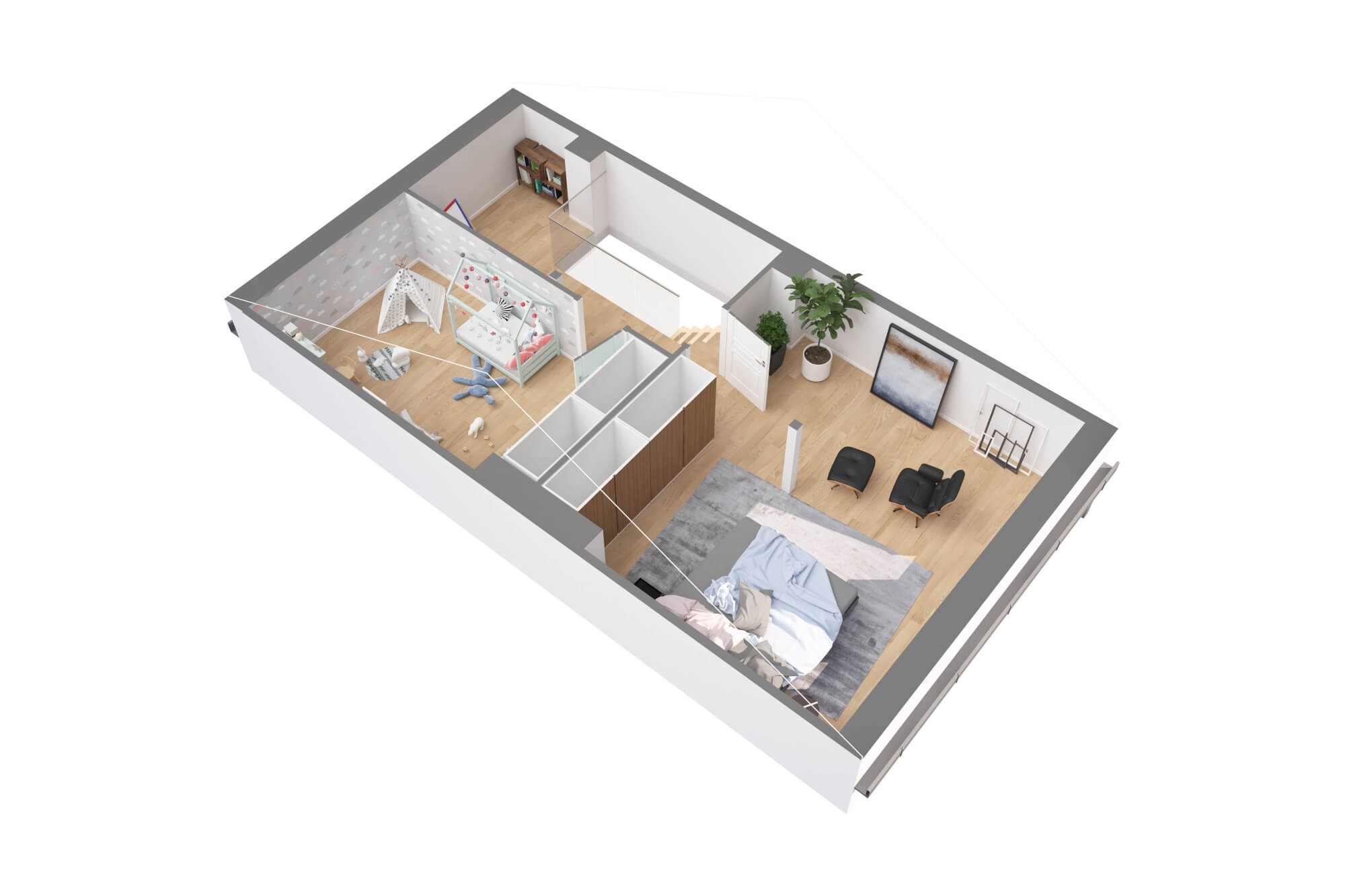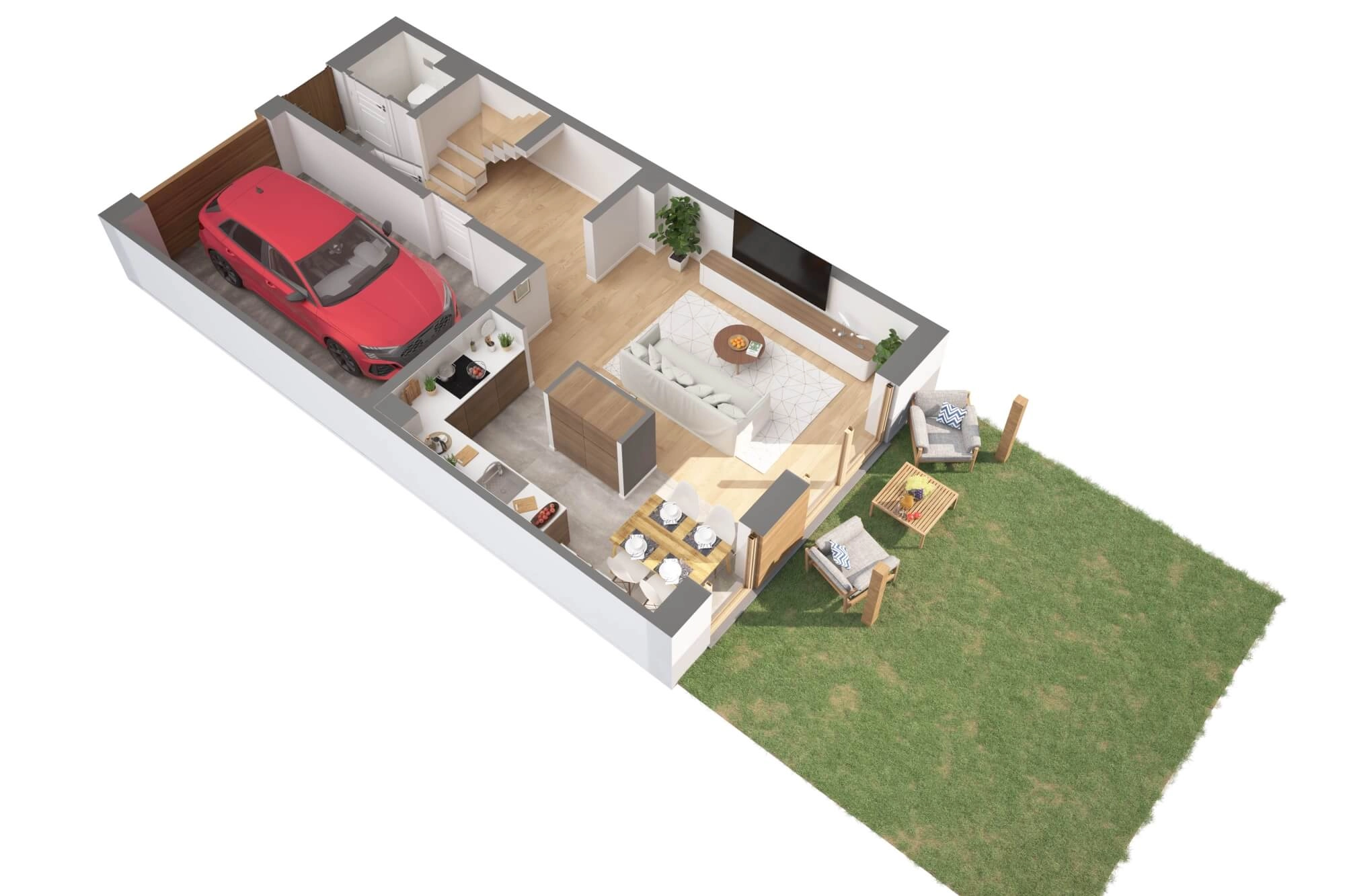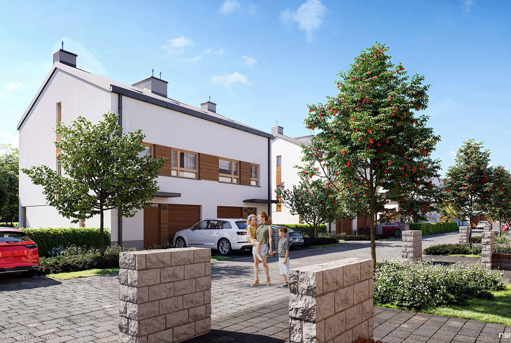 Architektura osiedla bazuje na minimalistycznej elegancji – biele, szarości i drewno idealnie komponują się z sąsiadującym lasem. Do każdego lokalu przynależy garaż, dodatkowe miejsce postojowe oraz prywatny ogród. O bezpieczeństwo mieszkańców dba całodobowy monitoring i zamknięty charakter osiedla.